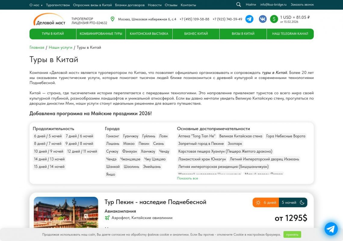Китай привлекает туристов сочетанием современных мегаполисов с древней историей и живописных природных парков. Среди популярных направлений — Шанхай, Пекин, Гуанчжоу, Чэнду. Поехать в тур в Китай из Москвы можно в любое время года. Комфортно путешествовать весной и осенью, когда в Поднебесной не жарко.